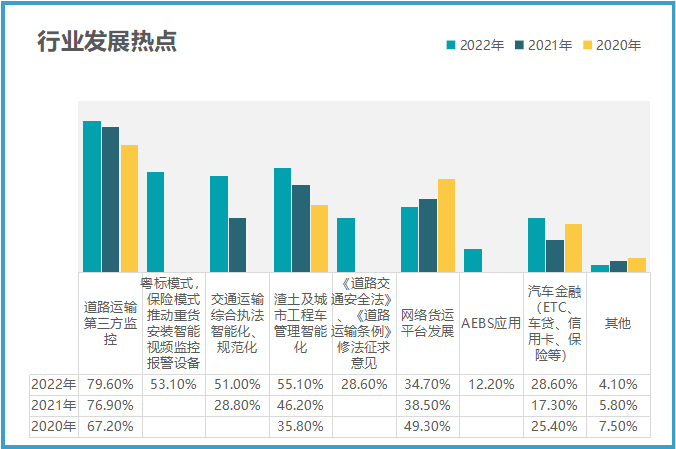 2021年,在行業發展熱點的關注度中,道路運輸第三方監控遙遙領先,穩居第一位,不過也不意外,從近三年的數據來看,道路運輸第三方監控一直備受關注;從公開新聞和招投標情況來看,第三方安全監控平臺出現頻率也在增高。但就目前來說,第三方安全監控平臺的發展雖有蓬勃之勢,但總體還是處在無序化發展的狀態,不少平臺還是換湯不換藥,提供的服務還停留在表面,還是通過政府管理或者規模優勢來獲得市場、利潤。總的來說,第三方安全監控平臺商業模式的多樣化也需要時間來培育。