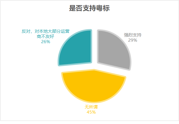 調查結果顯示,29%的運營商強烈支持粵標模式,不過支持與反對的聲音幾乎持平,有26%的運營商反對“粵標”模式,認為其對本地大部分運營商不友好,剩下的45%則表示無所謂,應是持觀望態度,反正火還沒燒到自家。