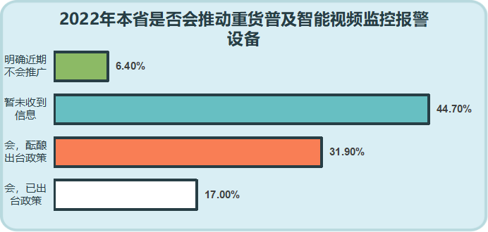 2021年廣東完成了30萬臺重貨安裝主動安全報警設備的工作,2022年其他省市是否會跟進安裝工作是現階段設備市場關注的重點。根據調查結果,只有少數運營商表示近期本省不會有推動動作,但,幾乎可以肯定重貨普及智能視頻監控報警設備勢在必行,只是時間問題。目前,福建、河北、南寧等省市已經開展了相關試點工作。