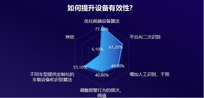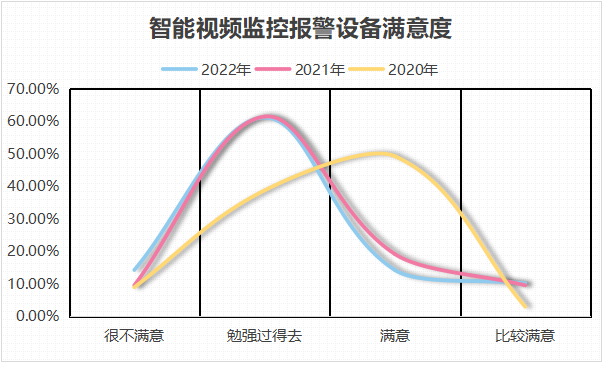 盡管沒有統一的強制政策出臺,也沒有財政支持、補貼政策,但這一年多來,在“粵標”模式的刺激下,同時也在“兩客一危”車輛安裝智能視頻監控報警設備之后成功降低了事故率之后,多地開始試點推動重載貨運、渣土車安裝智能視頻監控報警設備,包括盲區監測等。盡管現在處于全國性政策空白期,也處于防疫的反復持續階段,但生產安全監管的需求只會強化,而不會弱化。因此全國范圍內的重載貨運車輛安裝智能監控預警分析設備只是時間的問題,是步驟的問題,與之而來的是,設備的質量以及數據的精準、預警的有效性就變得更為重要。有意思的是,2020年是近3年來運營商對智能視頻監控報警設備滿意度最高的一年,2021年與2022年多數運營商認為在用的智能視頻監控報警設備的穩定性、報警的有效性只是勉強過得去,同時,可以看到2021年與2022年設備滿意度曲線基本重合,或許可以這么說,這兩年智能視頻監控報警設備的性能沒有多大長進。
