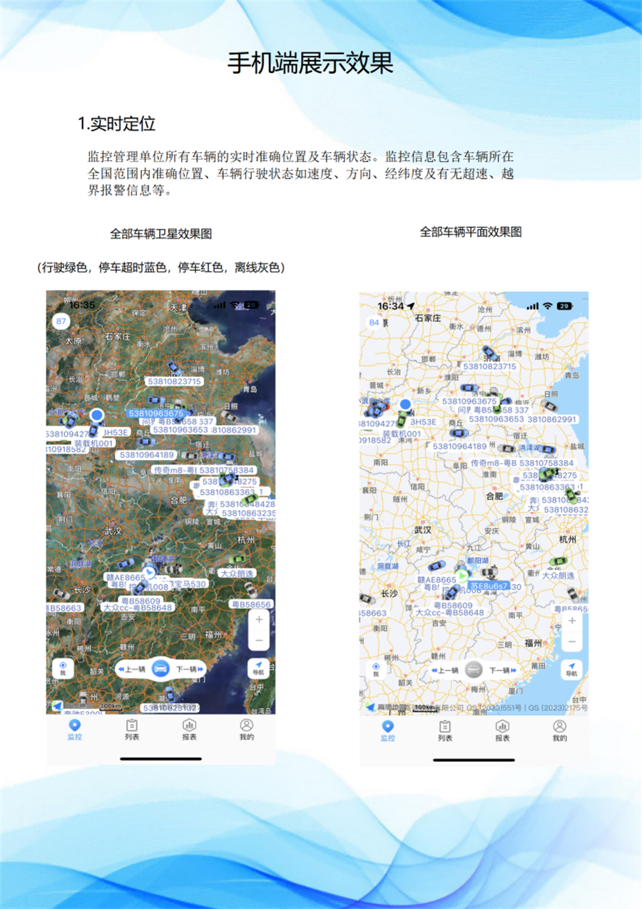 實時查詢車輛位置狀態,綠色代表車輛行駛,紅色代表車輛停止,灰色代表車輛離線,紫色代表車輛超速。多種地圖綜合顯示,平面地圖衛星地圖路況地圖可選