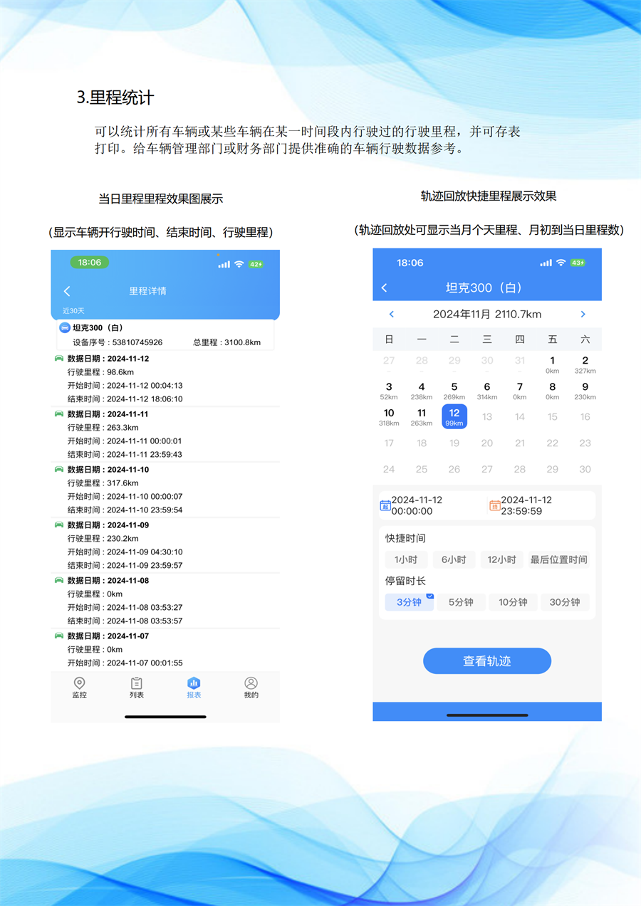 豐富詳細的車輛報表方便統計行駛里程停車地點停車時長發動機工作時長綜合油耗溫度超速統計