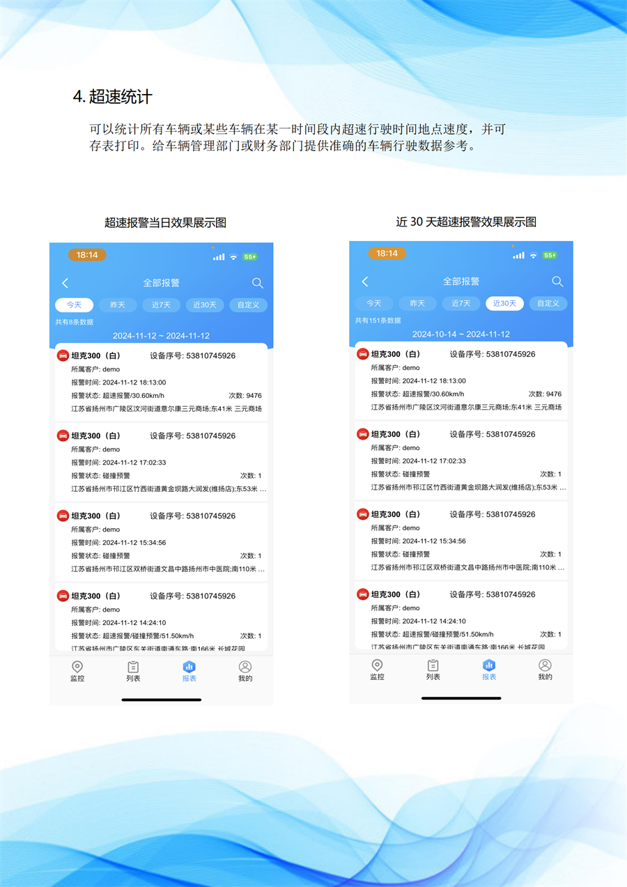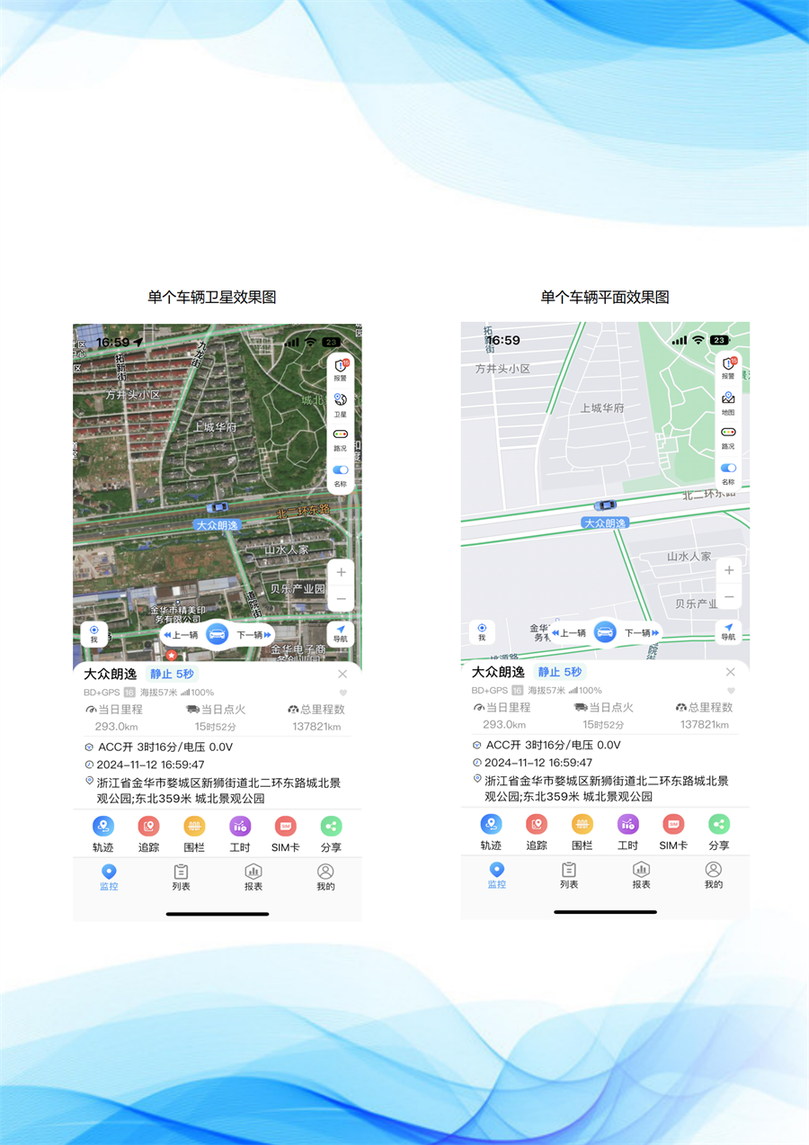 監(jiān)控管理單位所有車輛的即時準(zhǔn)確位置及車輛即時狀態(tài)。監(jiān)控信息包含車輛所在全國范圍內(nèi)準(zhǔn)確位置、車輛行駛狀態(tài)如速度、方向、經(jīng)緯度及有無超速、越界報警信息等