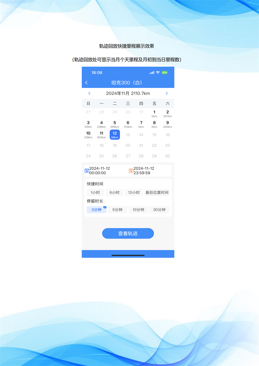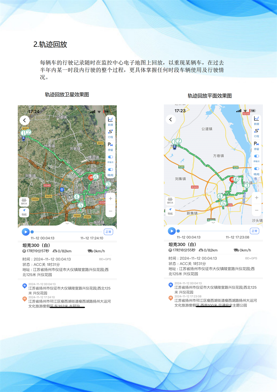 每輛車的行駛記錄隨時在監(jiān)控平臺電子地圖上回放,以重現(xiàn)某輛車,在過去半年內(nèi)某一時段內(nèi)行駛的整個過程,更具體掌握任何時段車輛使用及行駛情況。